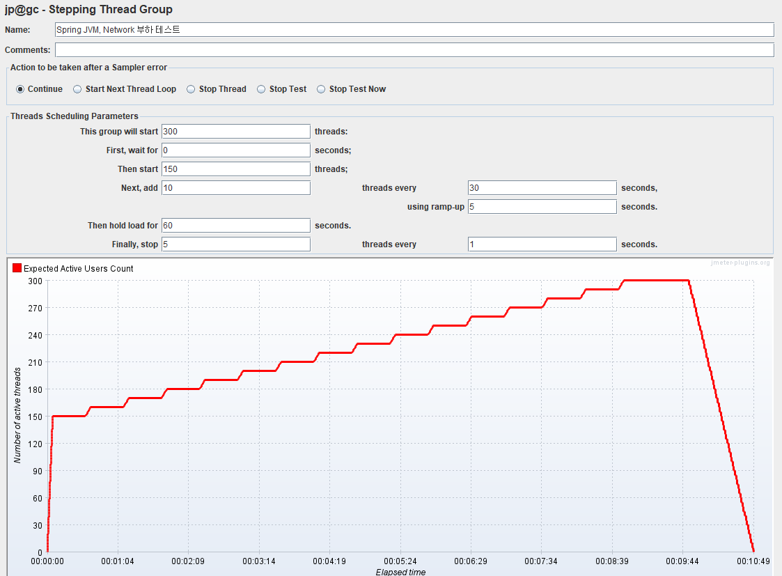 그래서 Jmeter "Concurrency Thread Group" 플러그인 중 “Stepping Thread Group”과 "3 Basic Graphs" 플러그인을 사용해서 단계별로 사용자의 흐름을 만들어서 테스트해보기로 했습니다. 단순히 강제로 부하를 걸기보다는 세부적인 시나리오로 부하를 주는 것이 정확히 어디까지 이 서버가 감당가능한지 알 수 있을 것 같아 진행했습니다.