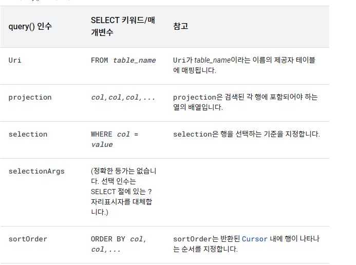 Uri는 콘텐츠 제공자가 제시한 데이터 테이블을 나타내고, projection은 검색할 열을 나타냅니다.