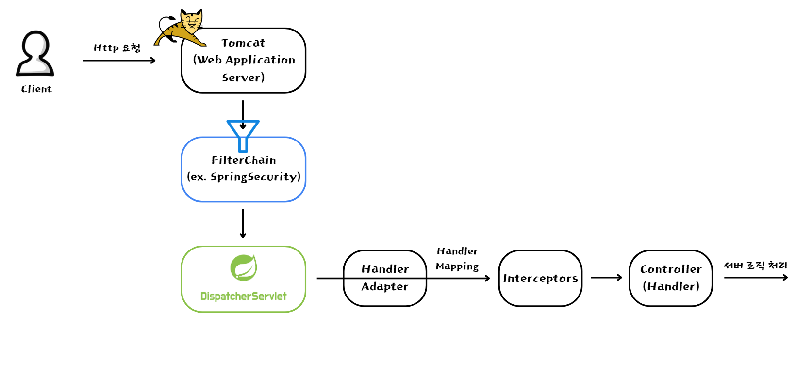Spring 어플리케이션 서버에서 HTTP 요청을 어떻게 처리하는지 흐름을 알고 계신가요?